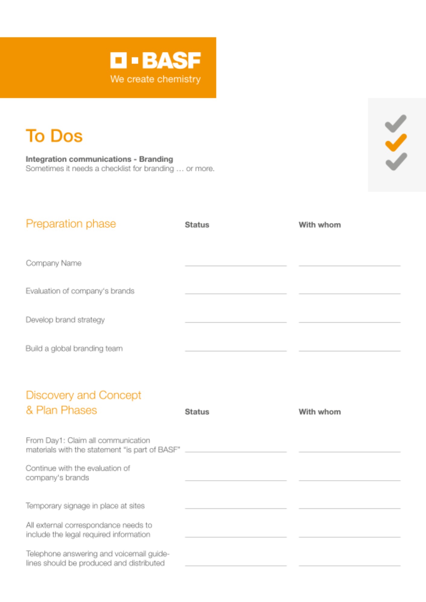 Rebranding is an important workstream in an integration. Based on the experience of previous integrations, it is highly advisable to develop an accompanying communications plan focusing on transparency for all employees with regards to the measures that need to be taken and the timeline for implementation of those measures.